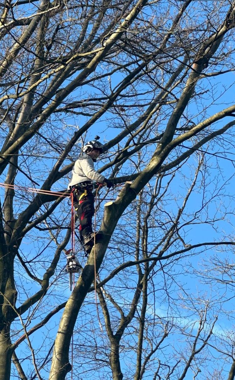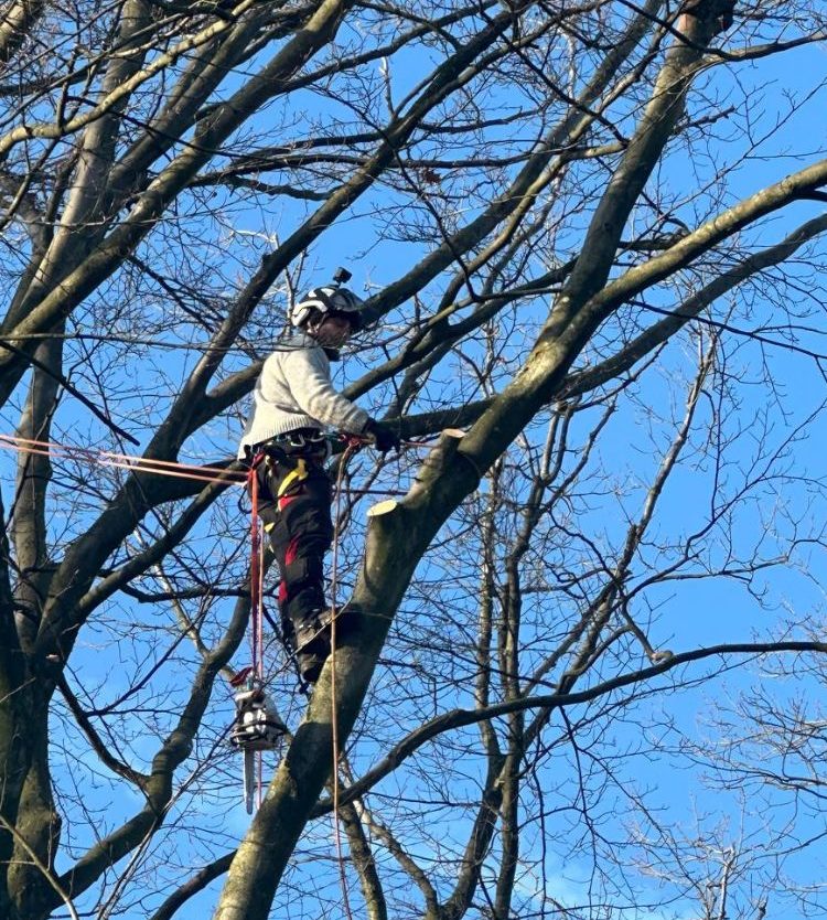 Präzise Baumarbeiten mit moderner Seilklettertechnik.